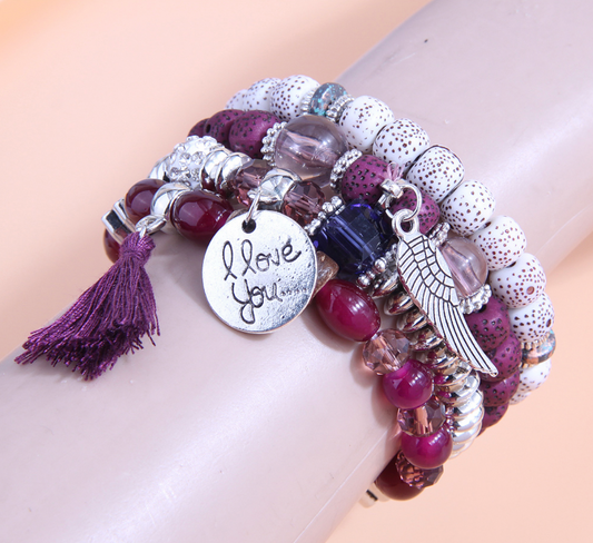 B26 Purple Heart Wings Tassel Multilayer Bracelet